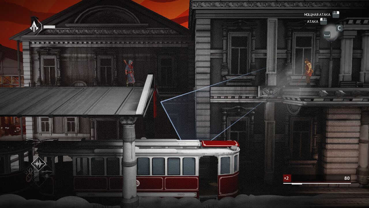Геймплей строится на балансе между скрытным прохождением и редкими, но напряженными стычками. Ольга вооружена пистолетом, мечом и метательными ножами, однако прямая конфронтация с многочисленными врагами часто заканчивается быстро и фатально. Игра поощряет использование окружающей среды: можно прятаться в сугробах, зависать на карнизах или отвлекать охрану, создавая шум. Боевая система требует тайминга и реакции, превращая каждое столкновение в короткую, но кинематографичную дуэль, где ошибка стоит жизни.