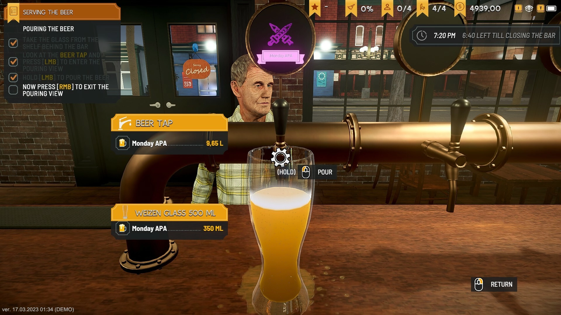 В игре Brewpub Simulator игроку предстоит взять на себя управление небольшим заведением, где подают свежесваренное пиво и простую закуску. Начинать придётся с нуля: закупать солод и хмель, осваивать рецепты от лёгкого пшеничного до насыщенного стаута, а заодно следить, чтобы посетители не ждали заказ слишком долго. Кухня требует внимания не меньше пивоварни — голодные клиенты уходят, а недовольные отзывы портят репутацию. Со временем появляется возможность расширить зал, обновить оборудование и нанять помощника, который возьмёт на себя часть рутины.
