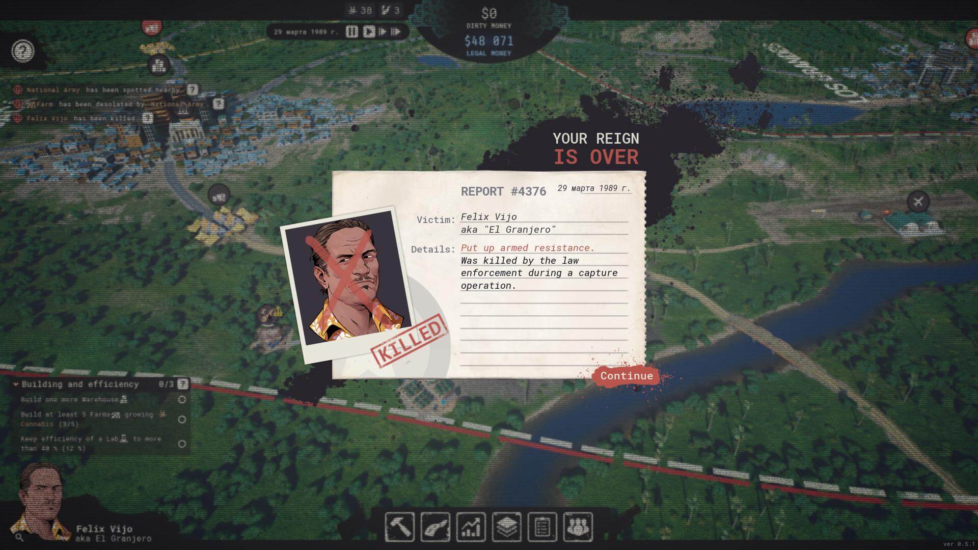 Экономика игры требует хладнокровного расчёта. Деньги от продаж нужно вкладывать не только в расширение производства, но и в подкуп, охрану, отмывание через прикрывающий бизнес. Игрок сам выбирает, на чём специализироваться: быстрые, но рискованные поставки или долгосрочные инвестиции в легальные активы. Иногда выгоднее пустить слух о конкуренте, чем устраивать вооружённое столкновение. Иногда — наоборот. Карта живёт своей жизнью: цены колеблются, маршруты блокируются, а местные жители то молча принимают вашу власть, то устраивают протесты.