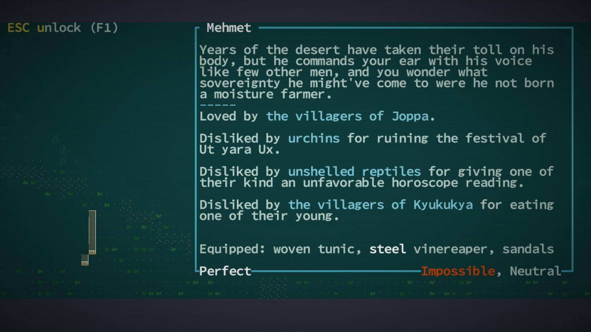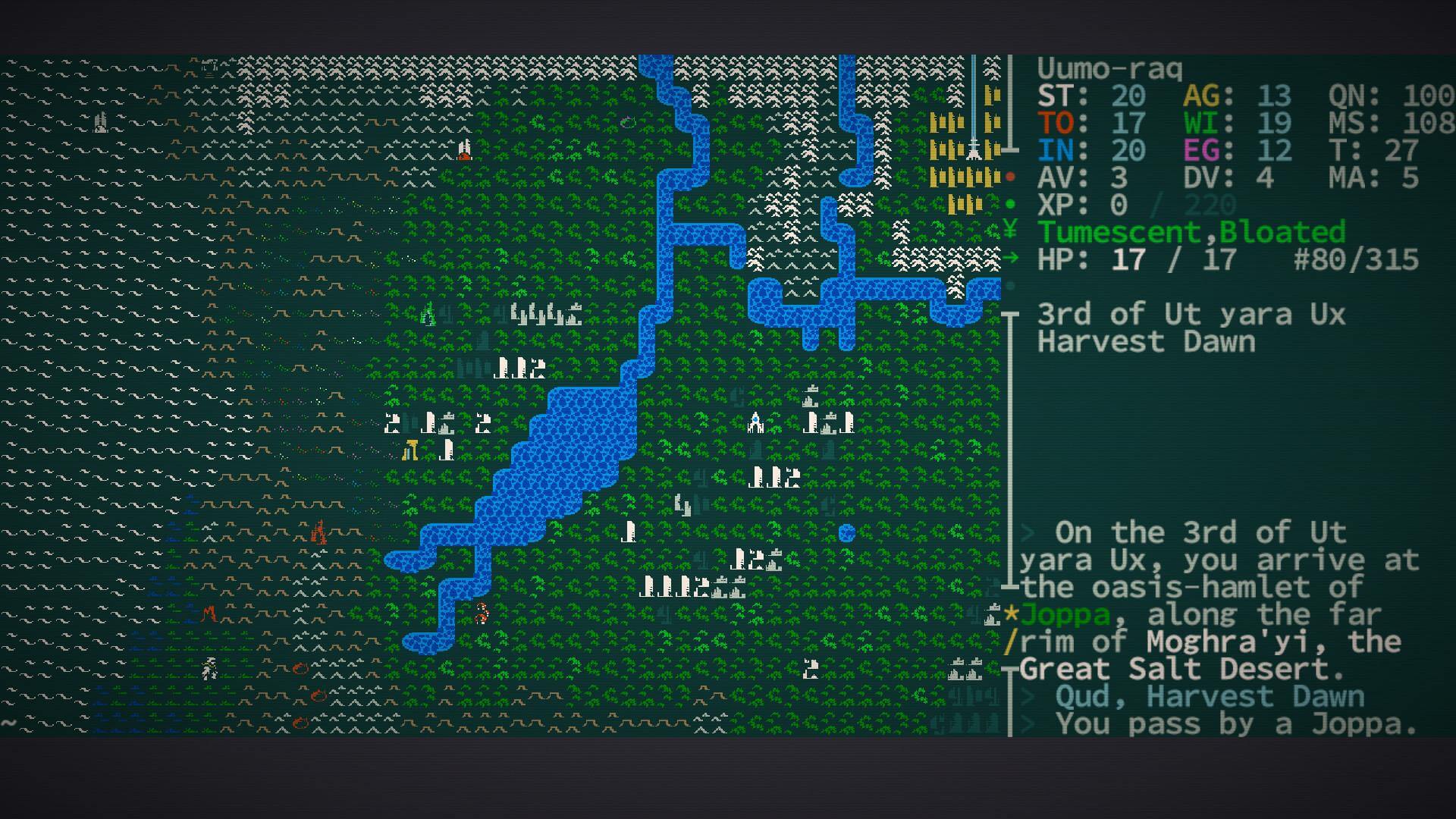 Мир здесь не фон, а живой организм. Племена ведут хронические войны за источники воды, торговцы распространяют слухи о новых руинах, а древние роботы до сих пор патрулируют заброшенные лаборатории, защищая секреты эпохи до Катастрофы. Большая часть локаций генерируется заново с каждой новой игрой, но ключевые точки — вроде священного города Джаббара или логова культистов-каннибалов — остаются, меняя лишь окружение и обитателей. Иногда находишь дневник предыдущего персонажа, погибшего в этих же песках год назад, и понимаешь: история Qud пишется не сценаристами, а вами и теми, кто шёл до вас.
