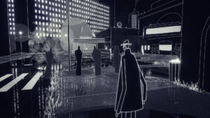 Визуально игра держится на контрасте — глубокая чёрно-белая графика, прорезанная редкими вспышками золота. Это не стилизация под старое кино, а осознанный выбор: в монохроме каждая деталь обретает вес. Свет фонаря на мокром асфальте, тень от шляпы на стене, всполохи Большого взрыва — всё работает как часть повествования. Разработчики из Feral Cat Den отказались от привычных анимаций в пользу статичных, почти живописных кадров. Иногда экран замирает на несколько секунд, давая игроку переварить увиденное. Такой темп может сбить с толку тех, кто привык к постоянному действию, но именно в паузах рождается странное ощущение: ты не играешь в детектива, ты сам пытаешься понять, что произошло.
