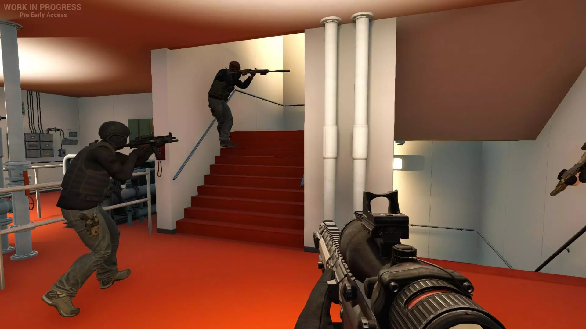 Миссии строятся вокруг штурма зданий и зачистки помещений — от заброшенных складов до многоэтажных комплексов. Игрок сам собирает экипировку перед вылазкой, выбирая между штурмовой винтовкой с глушителем и пистолетом-пулемётом для ближнего боя. В кооперативе с другом приходится действительно работать командой: один прикрывает, другой двигается, без надписей «следуйте за мной» на экране. Иногда молчаливая договорённость взглядом или пара шепотом произнесённых слов в микрофон — единственное, что отделяет успех от провала.