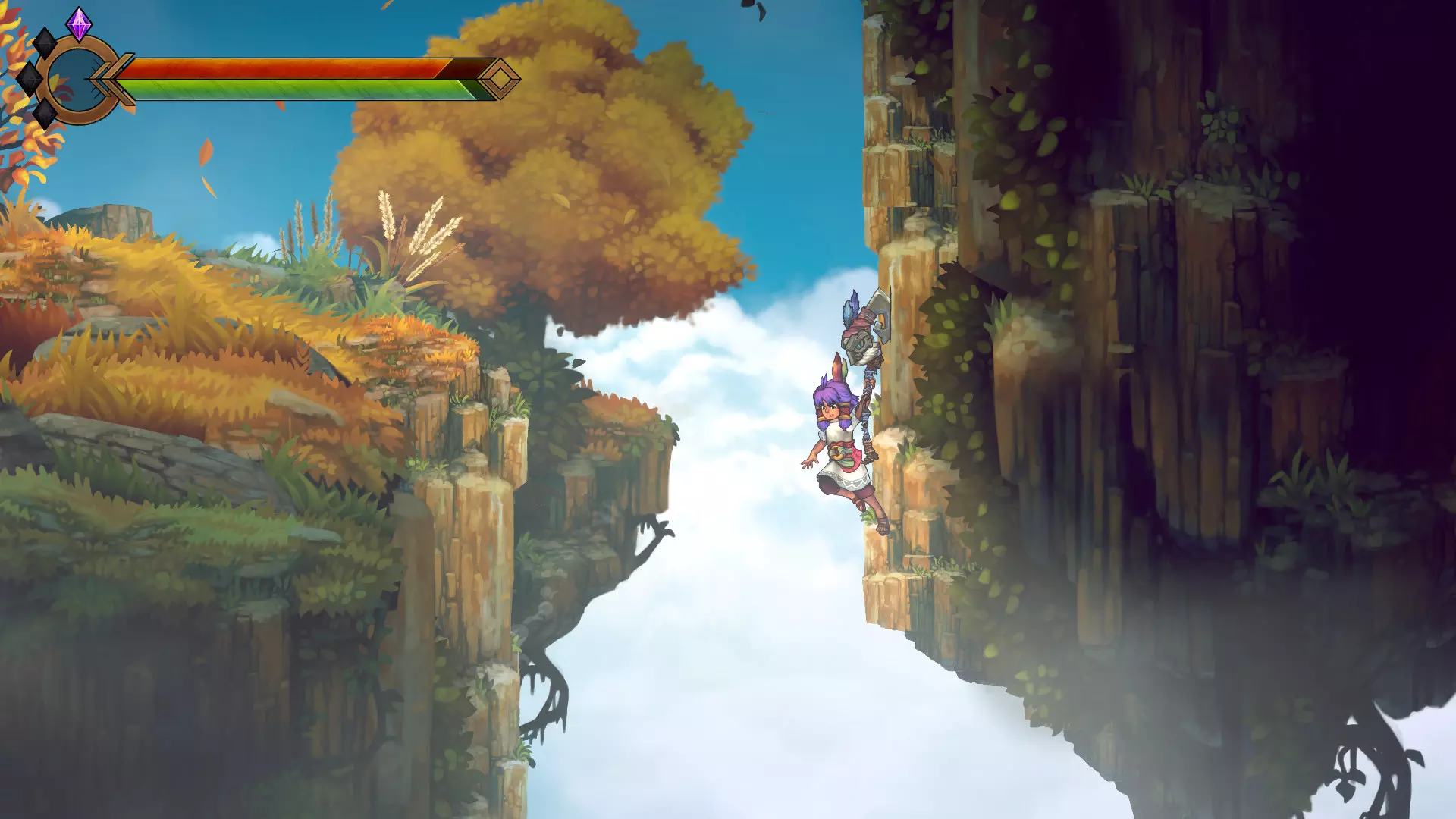 Геймплей здесь не притворяется чем-то большим, чем есть: бег, прыжки, короткие вспышки боя. Иногда приходится подумать, как перепрыгнуть с одной лианы на другую, иногда — отбиться от существ, которые не рады гостье. Карта раскрывается постепенно, как положено в метроидвании, но без излишней сложности. Главное — не механика, а ощущение: леса, нарисованные вручную, будто сошедшие со страниц старой книги, и тишина, нарушаемая только шелестом листьев.