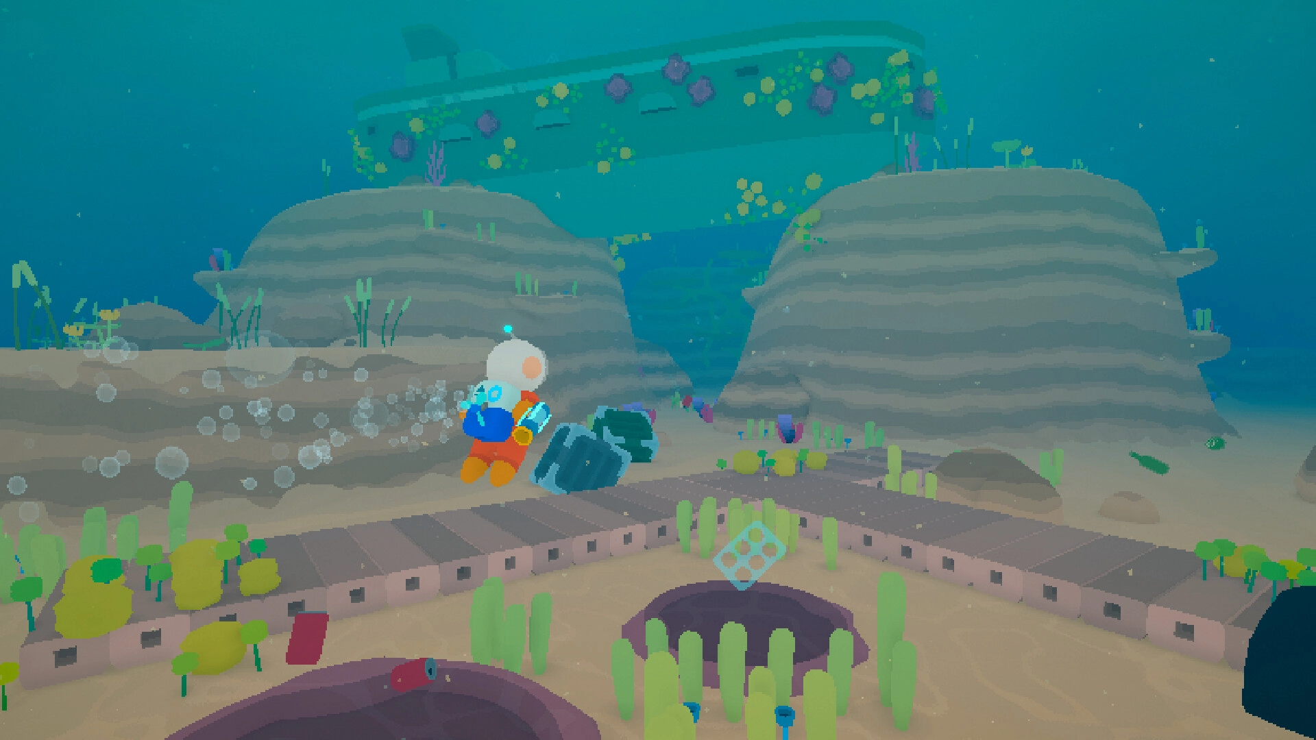 Основная механика строится вокруг взаимодействия с местной фауной. Морские обитатели поначалу прячутся в норы или уплывают при виде загрязнения, но начинают проявлять любопытство, как только вода становится чище. Каждое существо реагирует на действия игрока по-своему: одни подплывают ближе, чтобы рассмотреть аппарат, другие требуют конкретной помощи, например, удаления пластика с панциря.