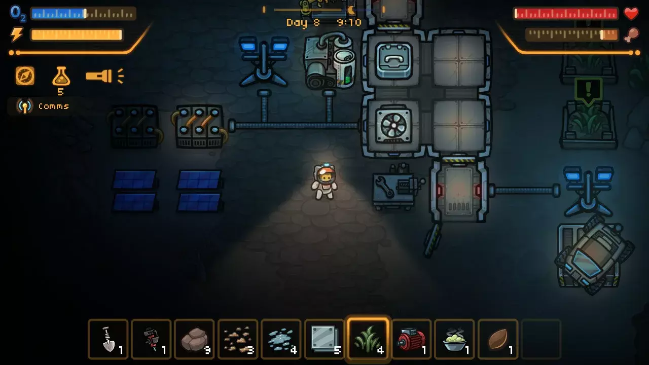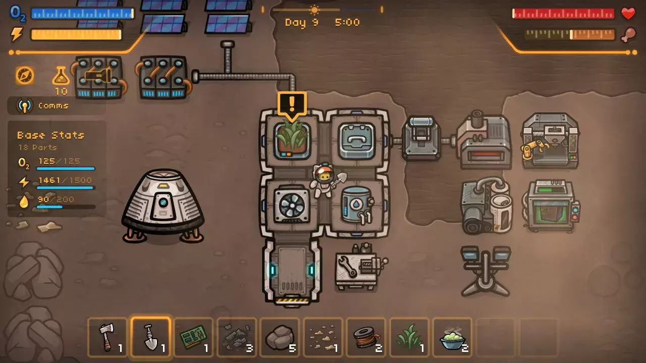 База начинается с единственной комнаты и примитивного генератора. Постепенно появляются мастерская для крафта, склад для припасов, лаборатория для исследований. Каждое новое помещение требует металла и времени — кошка методично таскает руду из шахт, расширяет тоннели под поверхностью, продумывает расположение модулей так, чтобы не тратить драгоценные секунды на переходы между ними. Иногда приходится жертвовать комфортом ради выживания: лучше построить ещё один кислородный модуль, чем очередную спальню.
