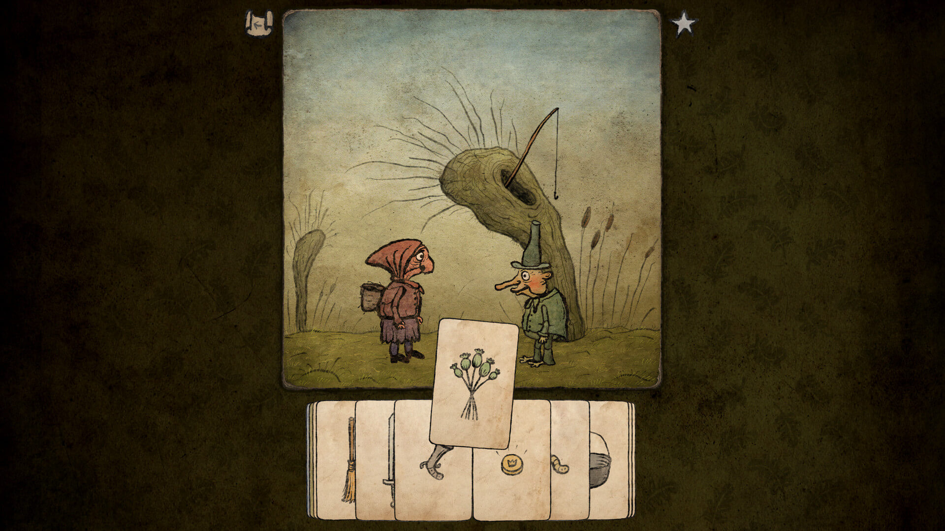 Графика сдержанная, почти набросочная: персонажи изображены парой штрихов, а локации едва намечены. Но именно эта простота работает — каждая карта оживает при взаимодействии, а анимации короткие и точные, без лишней суеты. Звук здесь важен не меньше изображения: потрескивание костра, шорох ветра, короткие музыкальные фразы при каждом удачном ходе. Игра длится часа два-три, но за это время умудряется рассказать несколько маленьких историй без единого слова.