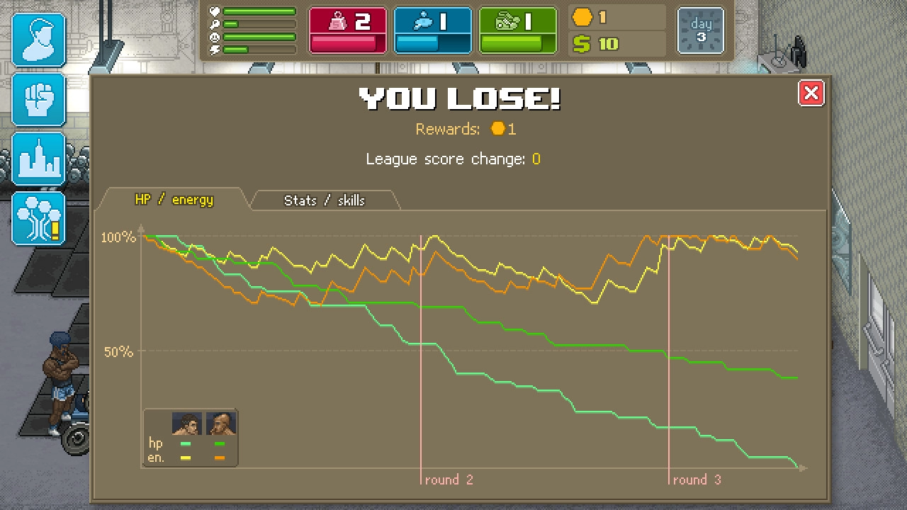 Пиксельная графика и саундтрек в духе 90-х не пытаются казаться «ностальгически очаровательными» — они просто работают. Интерфейс лаконичен, менюшки не захламлены, а юмор всплывает естественно: например, когда после изнурительной тренировки персонаж падает в обморок прямо на ринге, а судья равнодушно начинает отсчёт. Игра не обещает эпических свершений. Она предлагает что-то более простое и честное: встать с пола, перевязать кулаки изолентой и попытаться прожить ещё один день — на этот раз чуть умнее, чуть сильнее, но всё так же одиноко.
