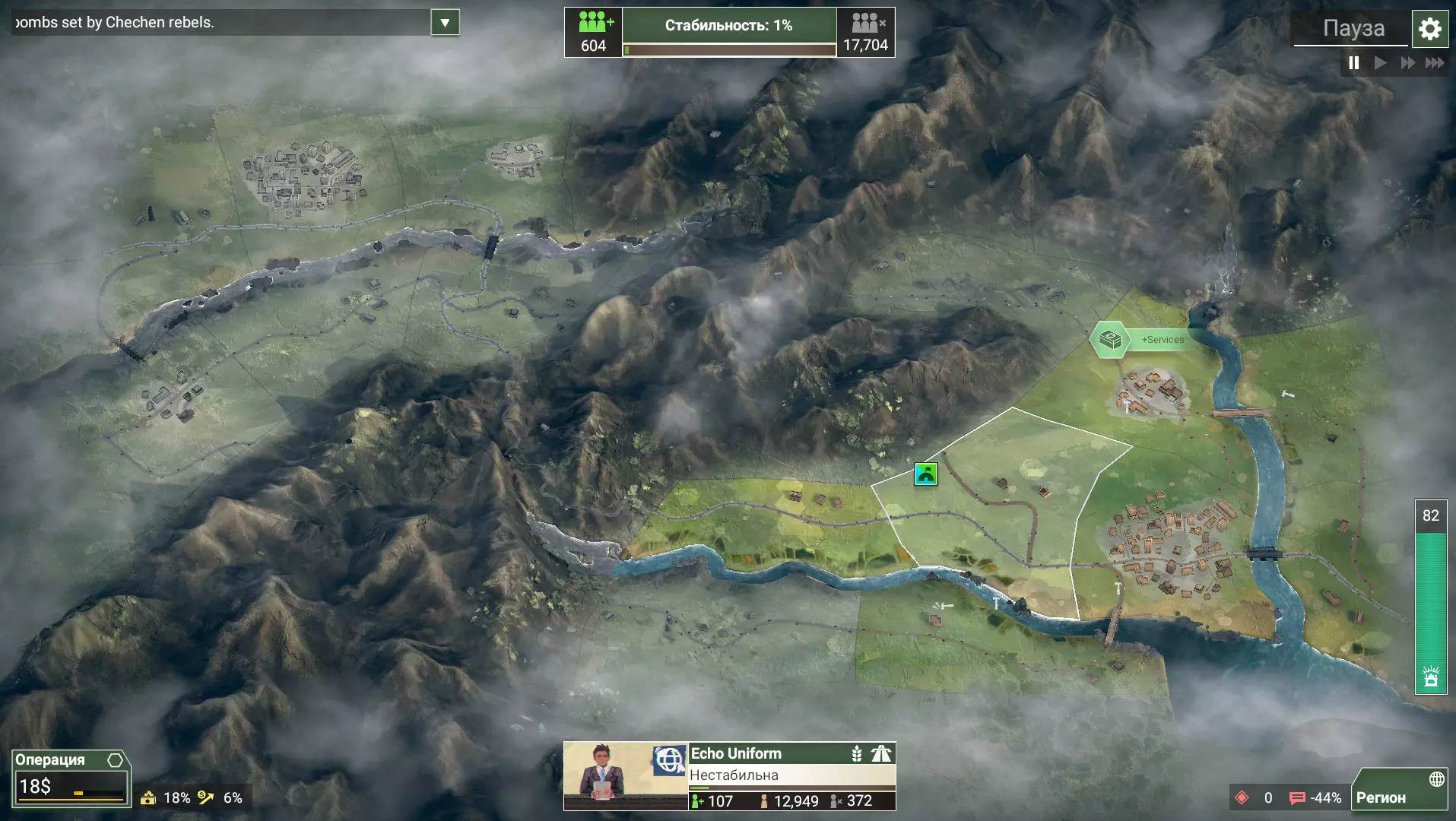 Графика сдержанная, почти схематичная, но именно это помогает сосредоточиться на сути — на связях между решениями и последствиями. Карта постепенно меняется: серые зоны влияния врага сжимаются или, наоборот, расползаются пятнами. Звуковое сопровождение добавляет напряжения — тревожный гул вертолётов, редкие выстрелы на заднем плане, голоса на непонятном языке из динамиков на контрольно-пропускных пунктах. Это не боевик и не симулятор войны — это попытка собрать осколки после неё.