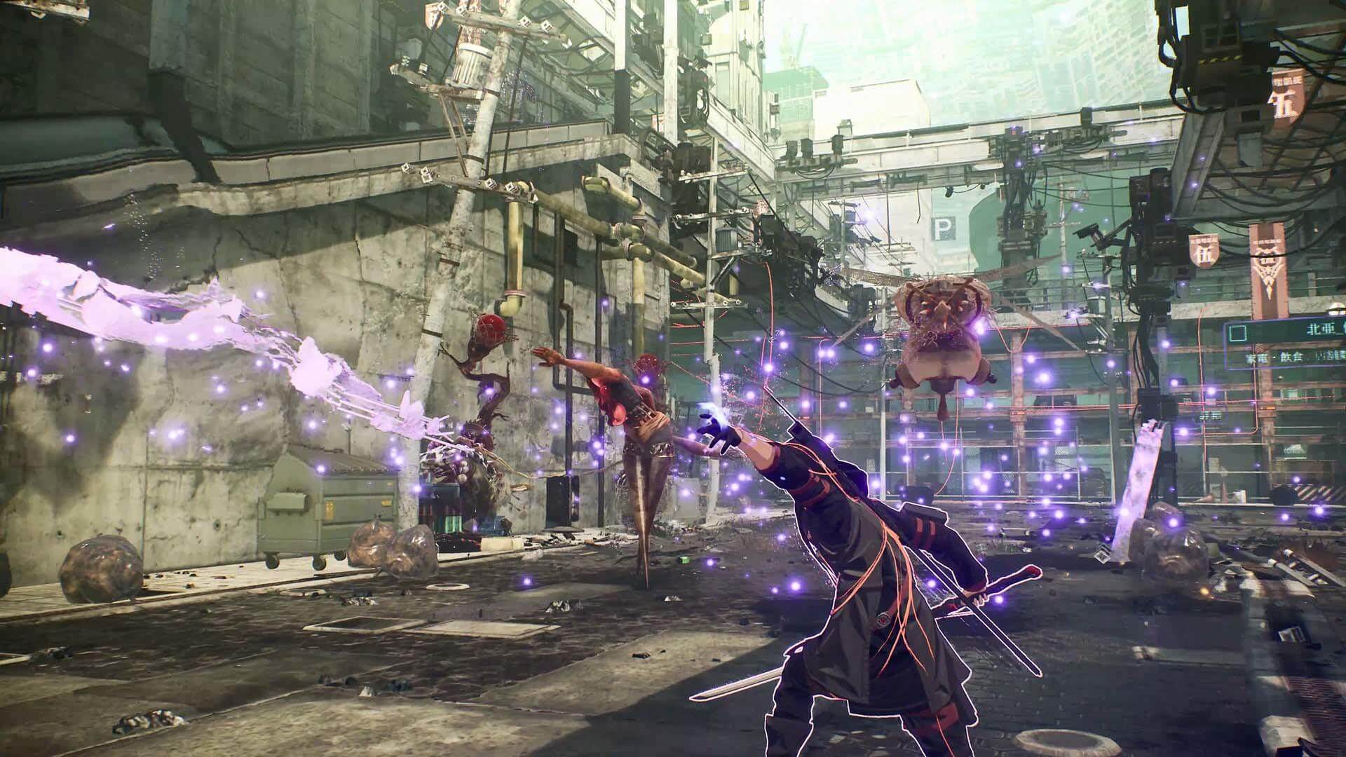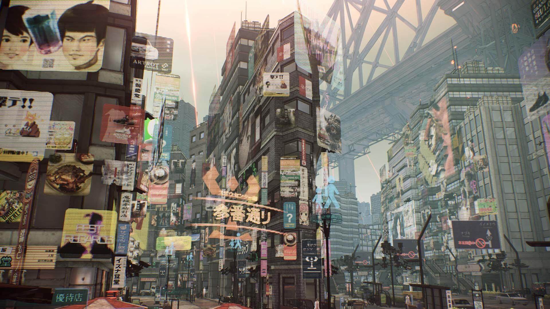 Города в игре выглядят как мрачная фантазия на тему близкого будущего — неоновые вывески соседствуют с облезлыми панельными домами, а поезда мчатся над улицами на магнитной подушке. Но за этой стилизацией чувствуется рука художника, а не алгоритм: где-то намеренно оставлена пустота, где-то — перегруз из деталей вроде размокших афиш на стенах или следов дождя на асфальте. Мир не идеален, и это работает в его пользу. Музыкальное сопровождение, написанное японской рок-группой, врезается в сцены схваток без предупреждения — гитарные рифы становятся частью ритма боя, а не просто фоном.