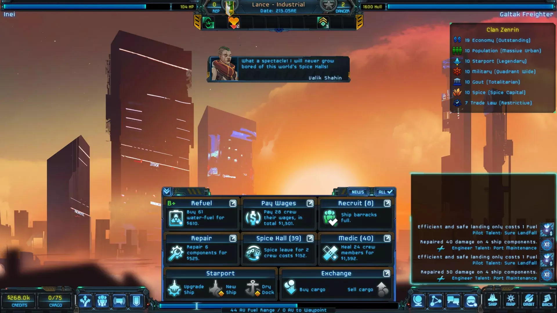 Вселенная живёт своей жизнью. Пока капитан торгует на окраине, в центре галактики могут разразиться войны, изменить цены на ресурсы или объявить награду за головы пиратов. Фракции ссорятся и мирятся, станции богатеют или приходят в упадок. Иногда выгоднее не лететь в ближайший порт, а подождать неделю — вдруг в соседнем секторе начнётся дефицит меди, а твой трюм как раз забит слитками. Тактика здесь не в кнопках, а в понимании, когда молчать, когда торговаться, а когда стрелять первым.