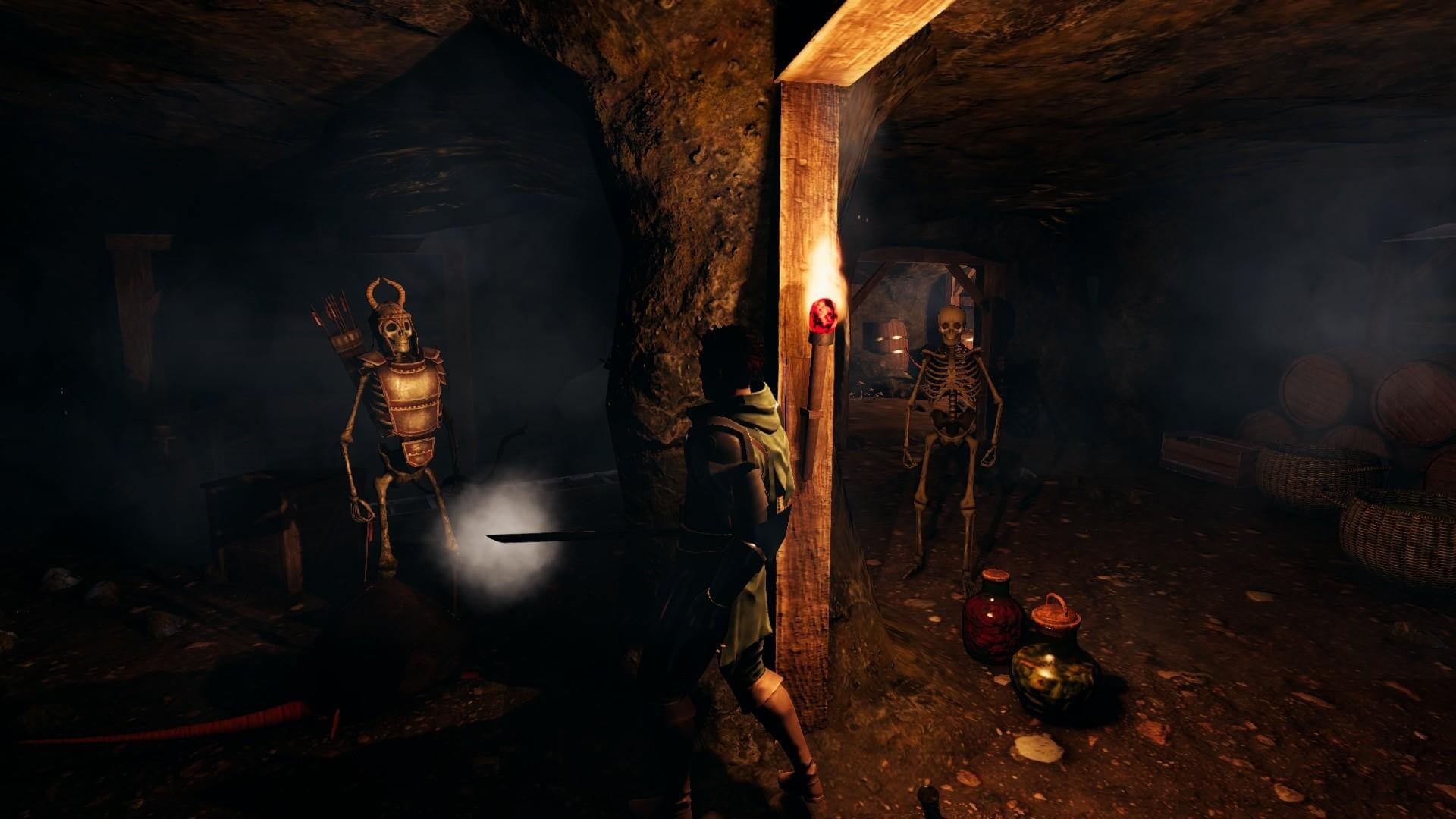Бой здесь не про комбо и не про стиль. Меч тяжёлый, замах — долгий, а промах часто стоит жизни. Каждый удар приходится выстукивать как диалог: блокировать, отступить, поймать миг неуверенности в противнике — и только потом рубить. Щит можно использовать не только для защиты: толкнуть врага к пропасти, отбить факел в соломенную постель, заставить монстра споткнуться о собственную тень. Система ранений простая — порезал руку, замедлился; повредил ногу, хромаешь. Лечиться придётся у костра, если доживёшь до него.