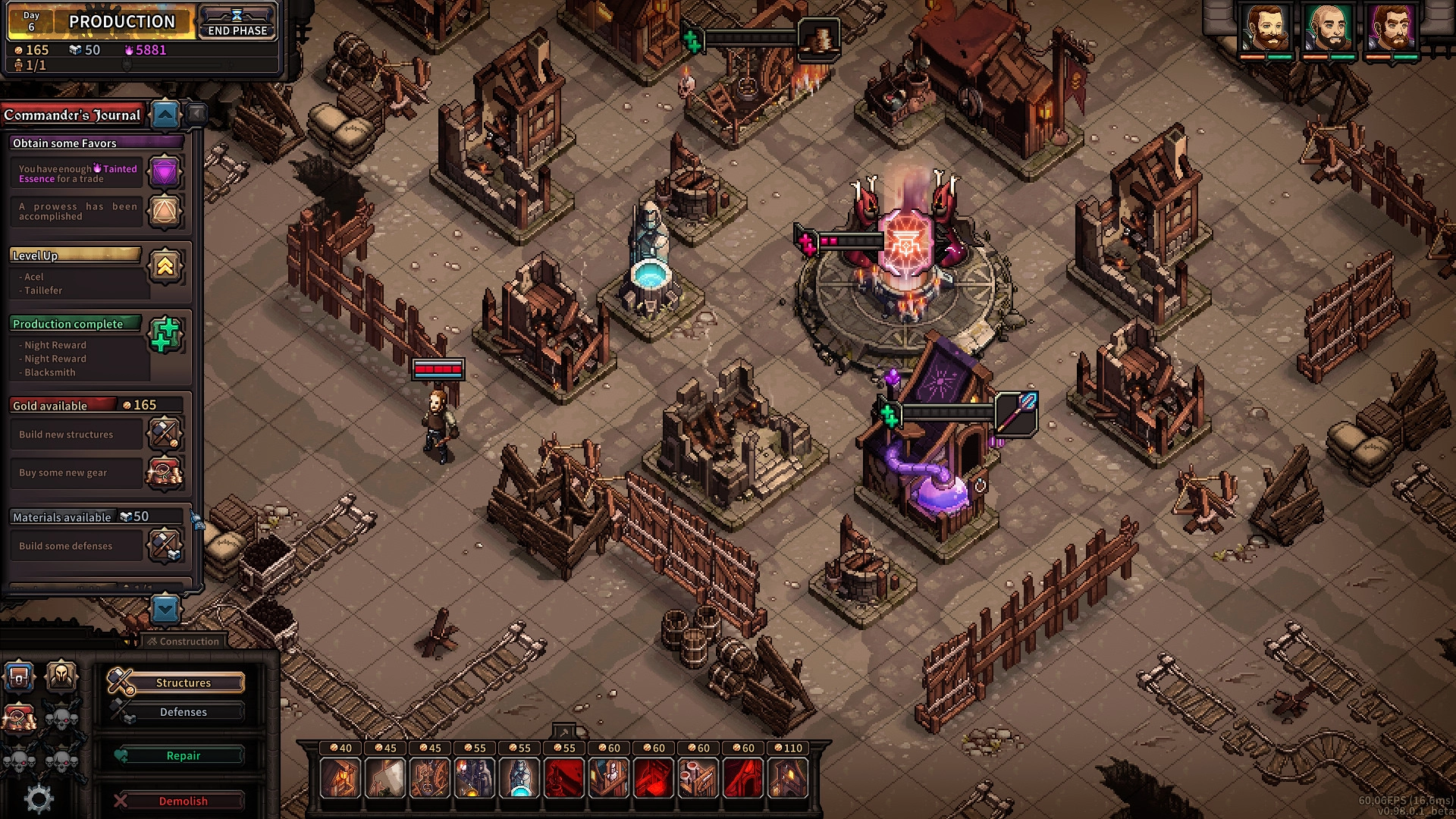 Днём наступает передышка. Можно укрепить стены, поставить ловушки на подходах к лагерю или вложить очки в новые способности героев. Прокачка нелинейная: маг может стать целителем или огненным демоном, воин — щитом для союзников или берсерком с двумя мечами. Но ресурсов никогда не хватает на всё, и приходится выбирать: усилить оборону сейчас или вложить в персонажа, который, возможно, погибнет до рассвета.