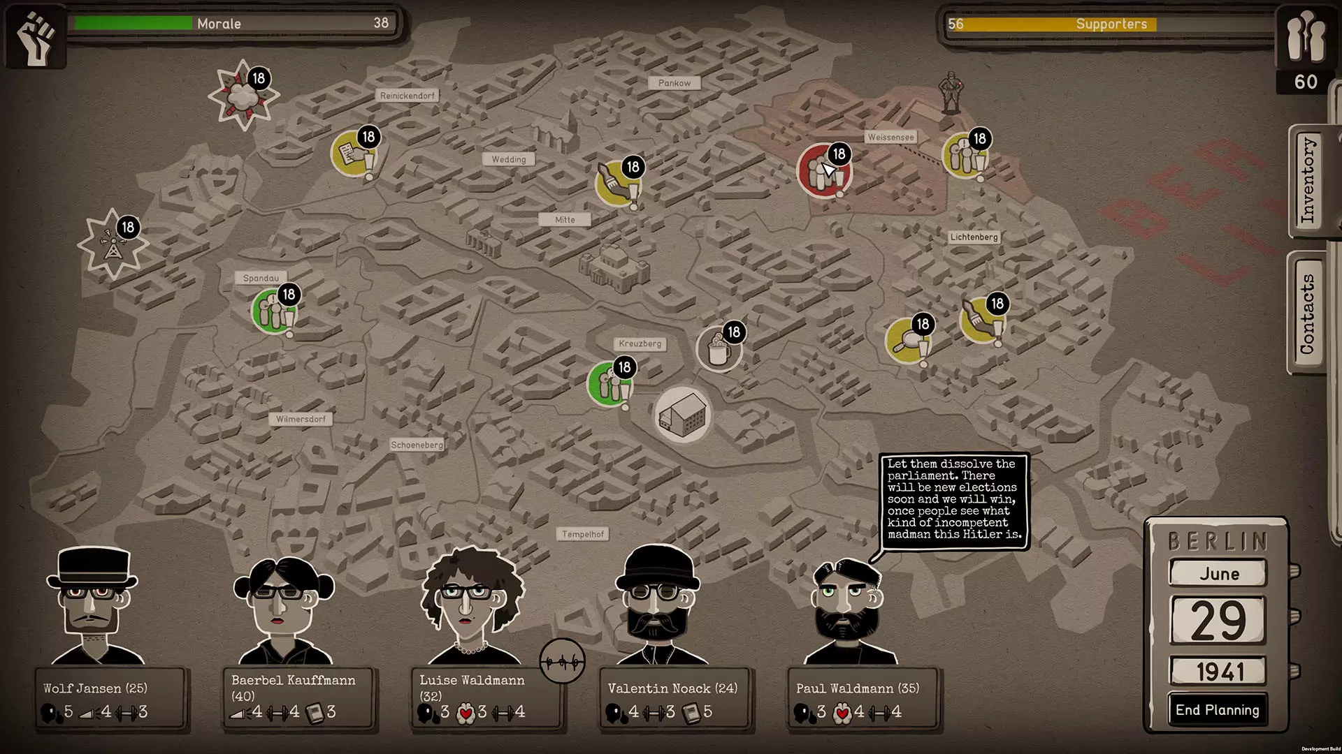 Графика выполнена в лаконичном пиксельном стиле, где почти вся палитра выдержана в серых тонах — только кроваво-красные акценты напоминают, куда завела страну эта история. На карте Берлина появляются точки: здесь сегодня арестовали соседа, там сожгли синагогу. Иногда игрок узнаёт, что его люди спасли конкретную семью, а иногда — что опоздали на день. Такие детали бьют точнее любых пафосных монологов о сопротивлении.