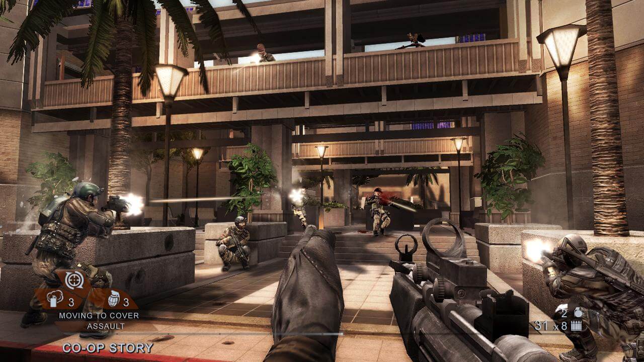 Игра разворачивается в Лас-Вегасе, но не в тех казино и отелях, куда водят туристов. Вас ждут темные коридоры конференц-залов, запутанные системы вентиляции и крыши небоскрёбов под палящим солнцем пустыни. Сюжетная кампания рассчитана на двоих — второго игрока можно взять с собой в кооперативе, и это меняет всё: вместе проще прикрывать друг друга при штурме комнат или одновременно атаковать с двух сторон. Есть и альтернатива — пройти в одиночку, отдавая приказы ботам, хотя они порой удивляют неожиданными решениями.