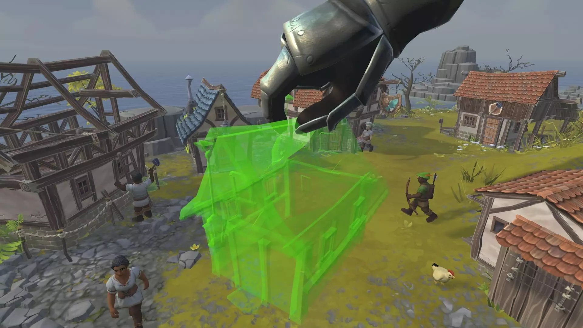 В Townsmen VR игрок оказывается посреди средневековой деревни, которую предстоит выстроить с нуля. Стоит лишь опустить руки в виртуальное пространство — и можно таскать брёвна к стройке, расставлять дома по склону холма или следить, как кузнец колотит по наковальне. Здесь нет сложных меню: чтобы проверить запасы пшеницы, достаточно заглянуть в амбар, а чтобы отправить лесорубов на работу — просто показать им, какие деревья рубить. Всё происходит медленно и основательно, как в настоящем поселении, где каждый житель ходит своей дорогой и помнит, зачем вышел из дома.