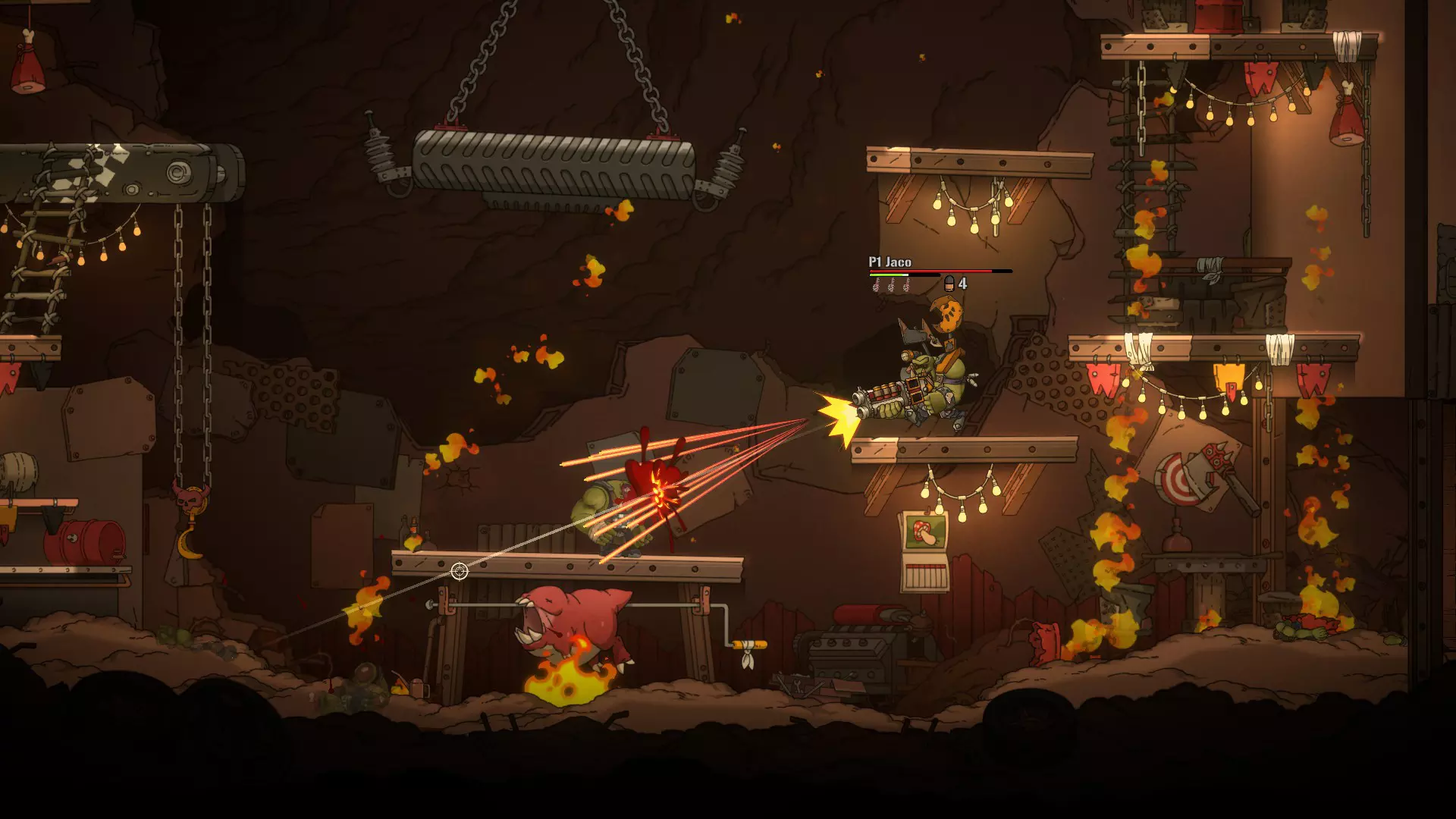Особое удовольствие — кооператив на двоих. В одиночку весело, но настоящий орковский дух раскрывается, когда друг рядом хватает трофейную пушку и начинает стрелять сквозь твою позицию, а ты в ответ орёшь что-то нечленораздельное и бежишь ему на помощь через град пуль. Система оружия и улучшений простая до грубости: находишь что-то покрупнее — ставишь вместо старого. Никаких древ прокачки, только инстинкт и жажда драки.